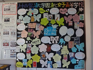 中央廊下の東側に、ノートルダム清心学園理事長 故シスター渡辺和子を追悼する展示ができました。写真とともに、著書からの心に響く言葉が。先生も生徒も見入っています。西側には、図書委員制作の学校紹介の展示です。清心の学習活動や行事の豊かさがうかがえます。