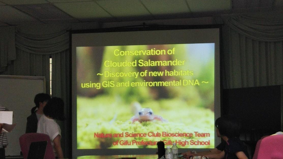 午後はまず岐阜高等学校の生徒さんが「Conservation Clouded Salamander ~Discoverly of a new habitats using GIS and environmental DNA」というタイトルで研究内容の発表をしました。