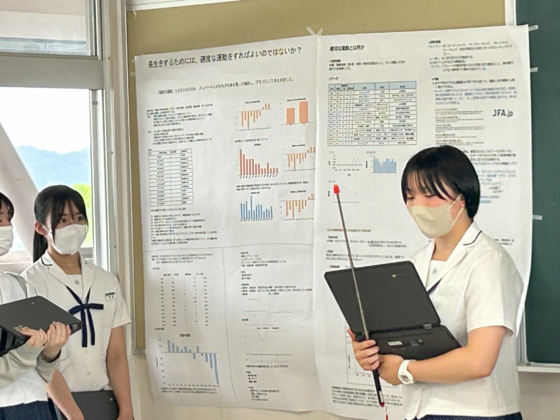 先週までに生徒は3つのグループに分かれ、長生きするために必要なものを「適切な水分量の摂取」「適切な運動」「適切量のご飯と納豆を食べること」とそれぞれ仮説を立て、探究をしてきました。