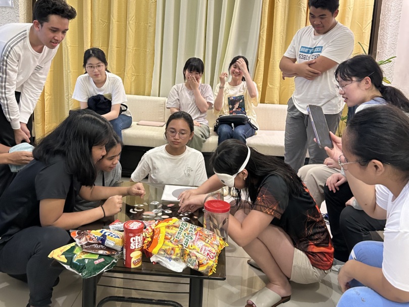 キャンプファイヤーをしたり、フィリピンのお菓子を食べたり、ホテルでも福笑いで遊んだりして盛り上がっています。