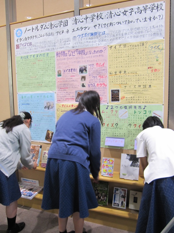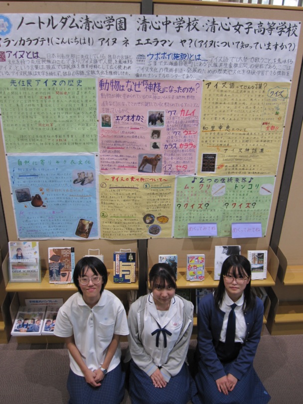 「イランカラプテ!アイヌ ネ エエラマン ヤ?(こんにちは!アイヌについて知っていますか?)」というタイトルで、研修旅行の事前学習を兼ねて、高2の図書委員全員で完成させました。