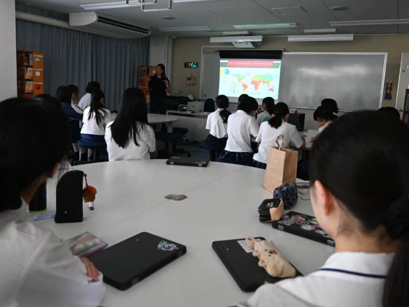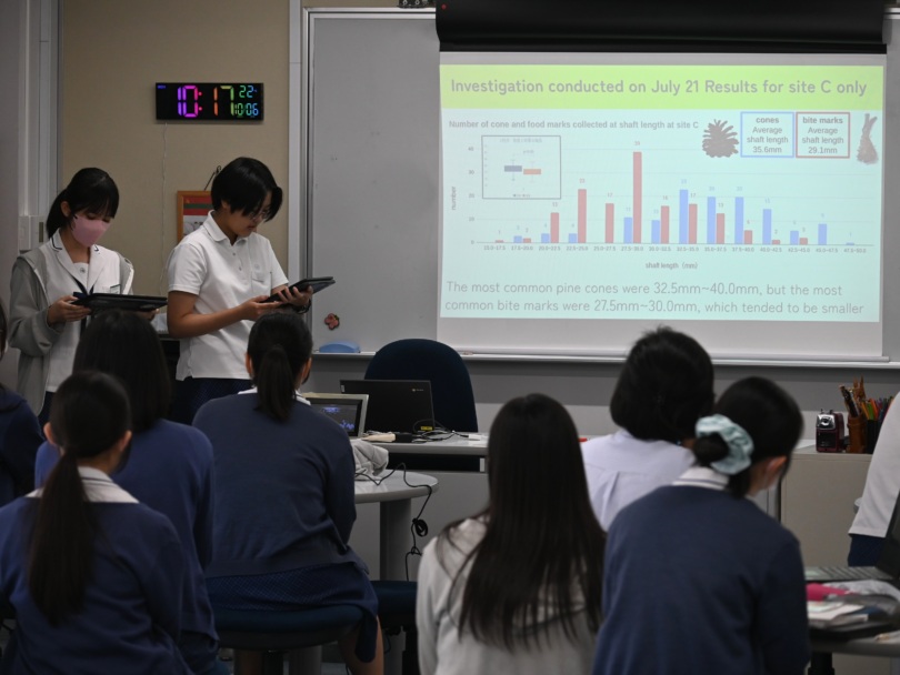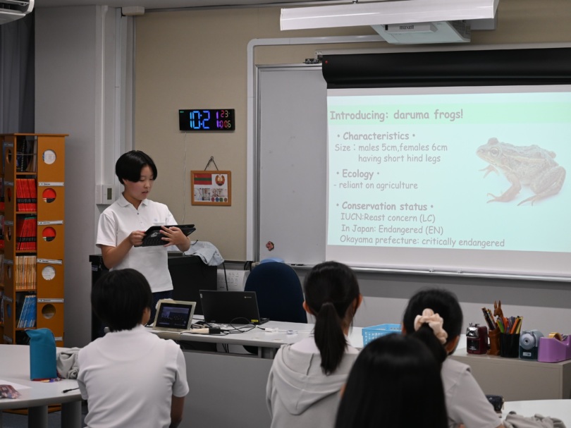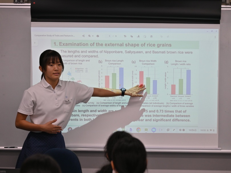 まず高3生命科学コースの生徒たちが、自身の課題研究内容を英語で発表しました。