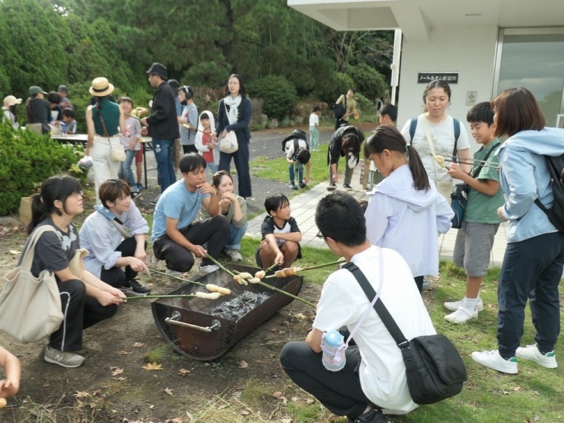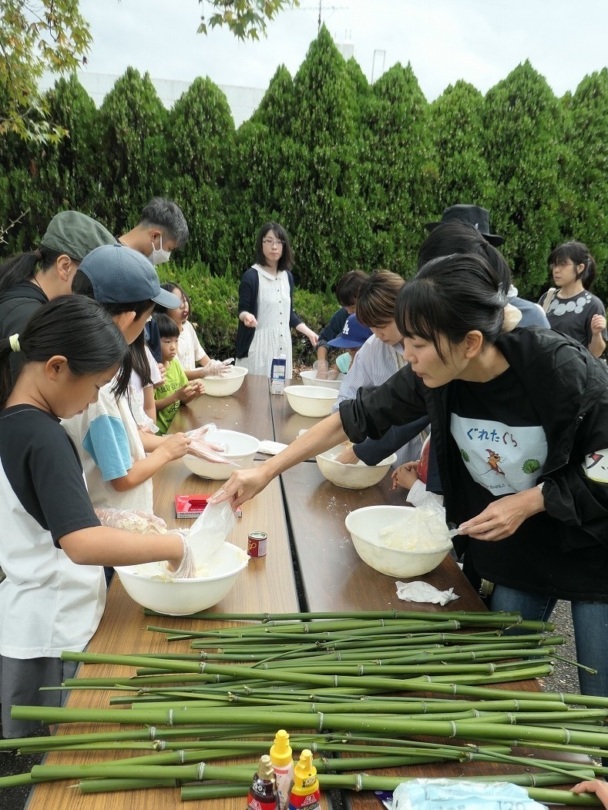 竹パンはホットケーキミックスをこねて竹に巻き付け、竹炭でじっくりと焼きました。