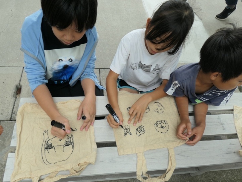 エコバックに好きな絵を描いたり、絞りを入れて、染色液に漬け込みました。