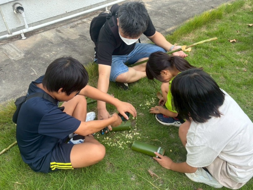 10月19日、小学生親子と放課後デイサービス団体、スタッフ等合わせて60名弱で竹ワークショップを行いました。