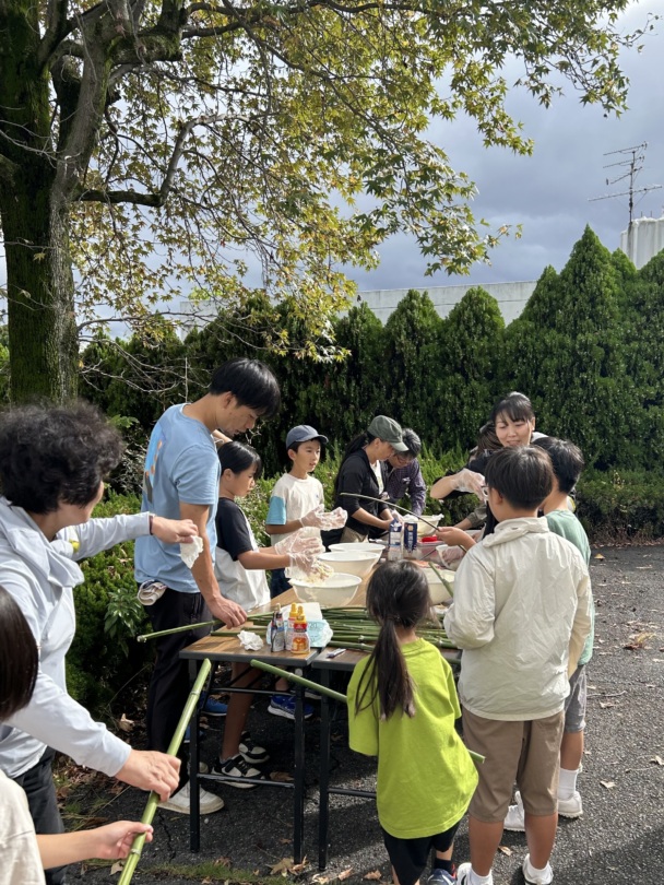 その後、聖堂横で竹パン作りと竹工作をしました。