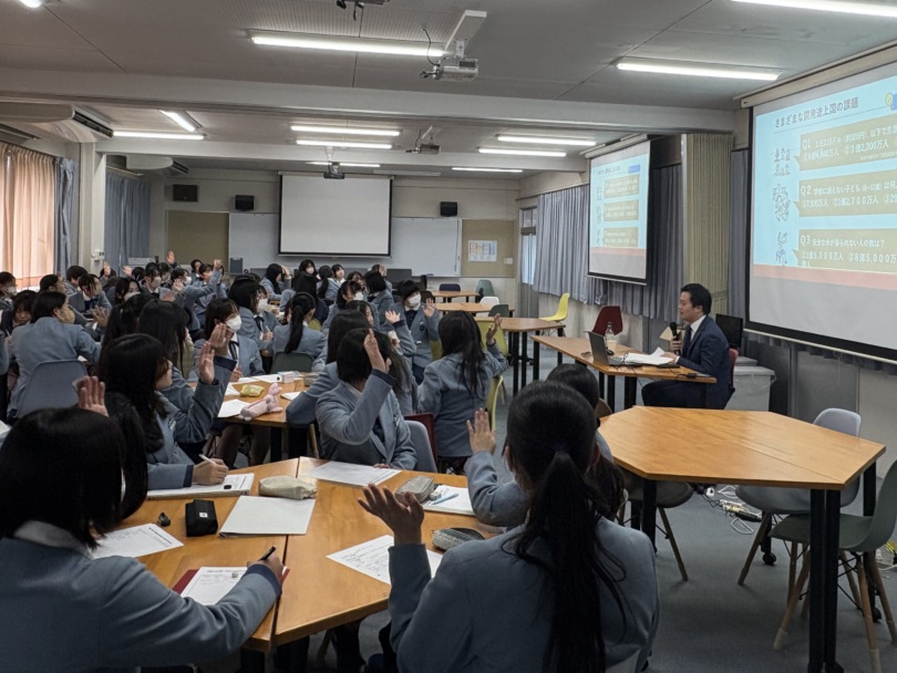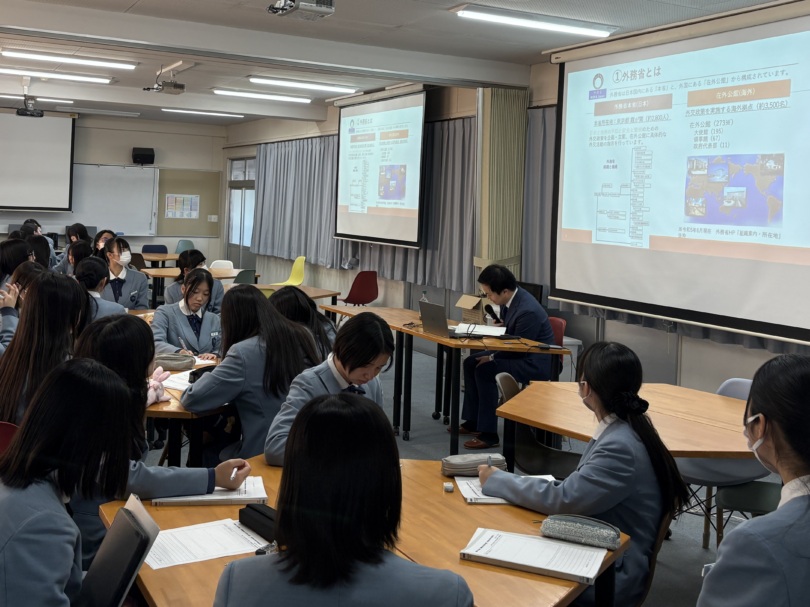 11月28日、高3「公民演習」の授業において外務省の公開講座が実施され、生徒だけでなく保護者の方々も参加してくださいました。