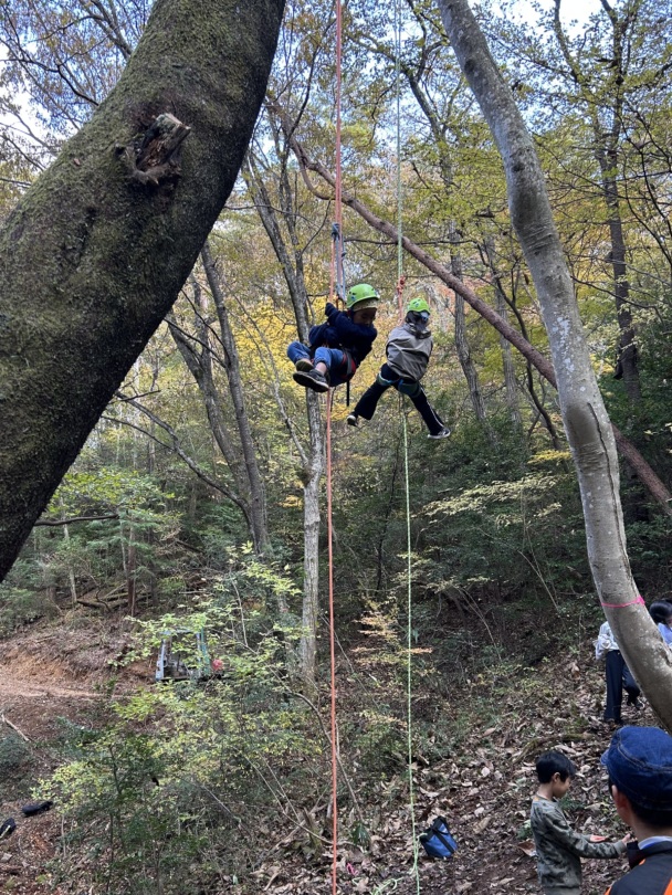 服部興業山林部の方々が、植林地にある雑木林エリアにツリークライミングの設備を準備してくださり、子どもたちは交代で体験を楽しみました。