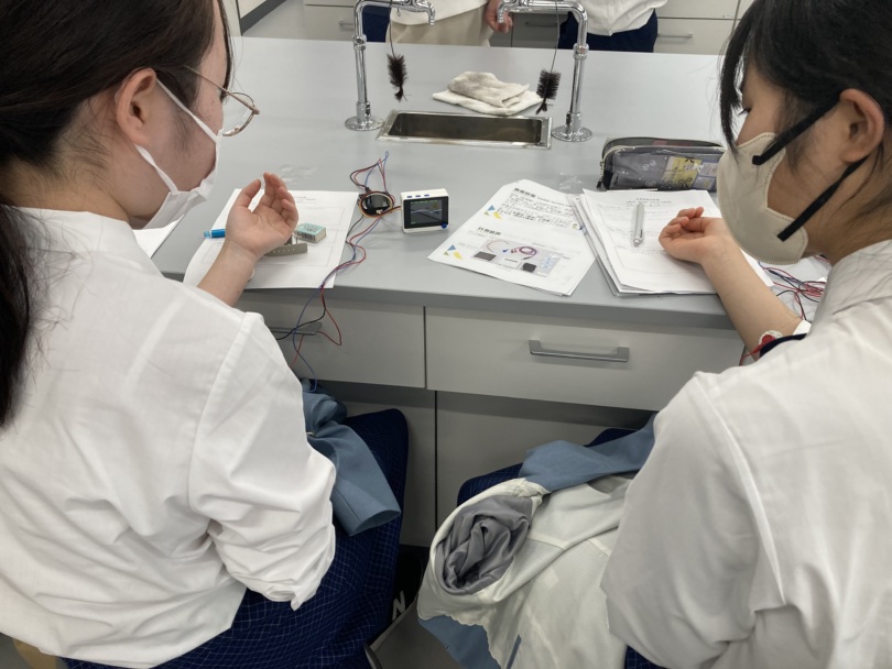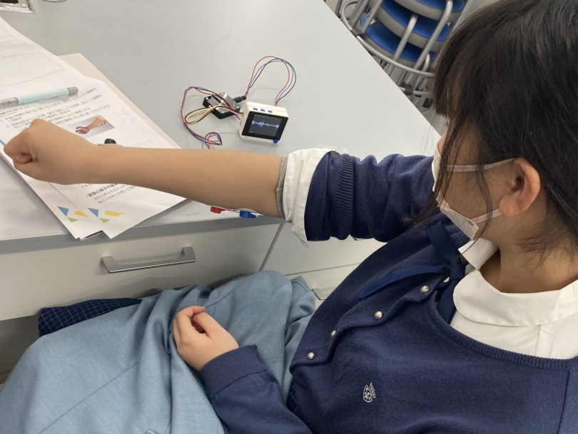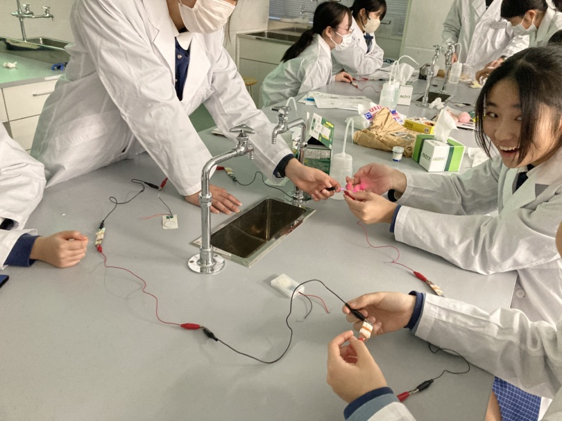 エネルギー物質学科の先生から「興味のある理系科目からどのように進路を深めるか」という講話をいただいたうえで、「生体信号の計測」と「化学電池の作成」の実習を行いました。