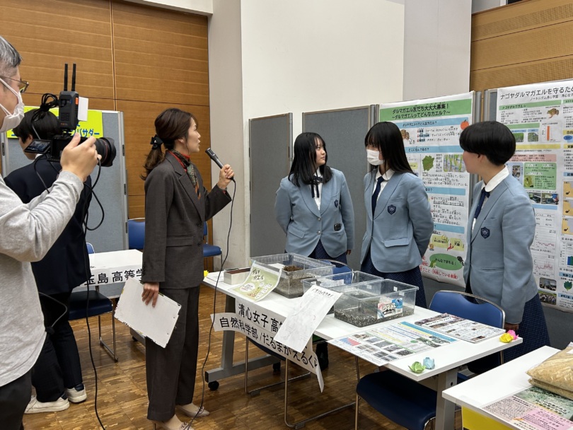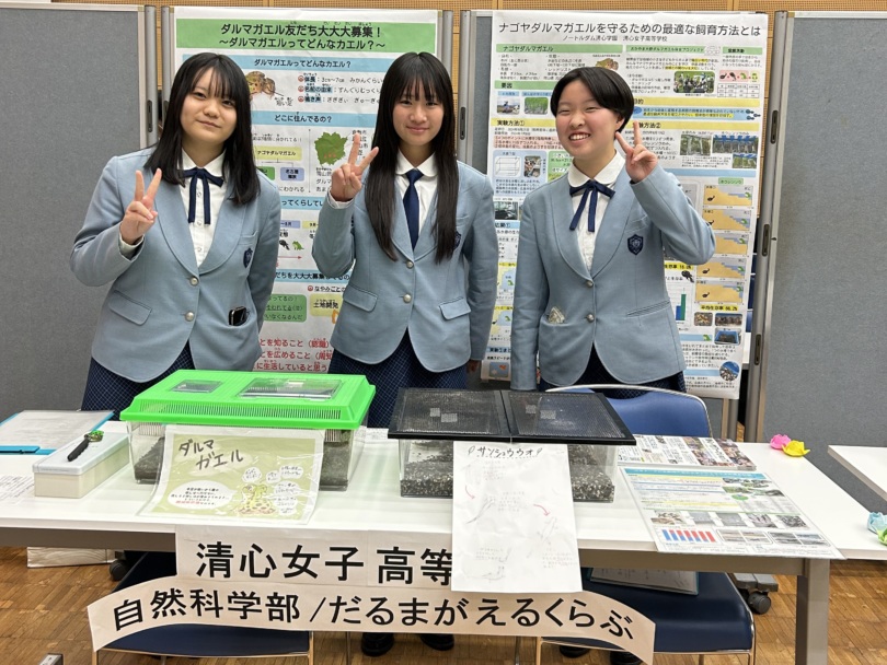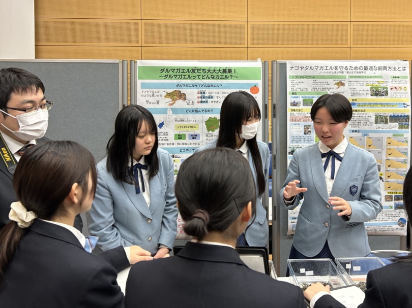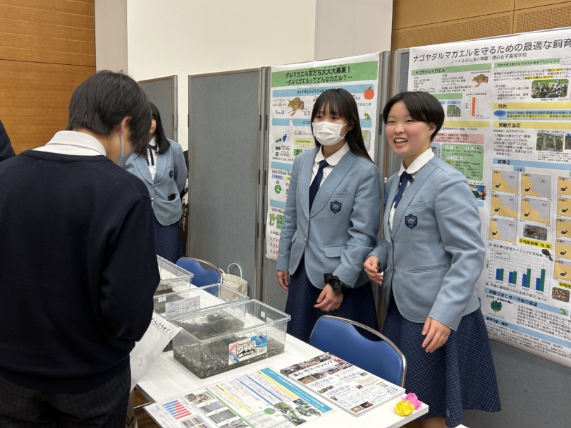 12月13日、「STOP温暖化くらしき講演会」の高校生ポスターセッションに参加し、ダルマガエルとサンショウウオなど自然科学部の取り組みに関するブース展示を行いました。