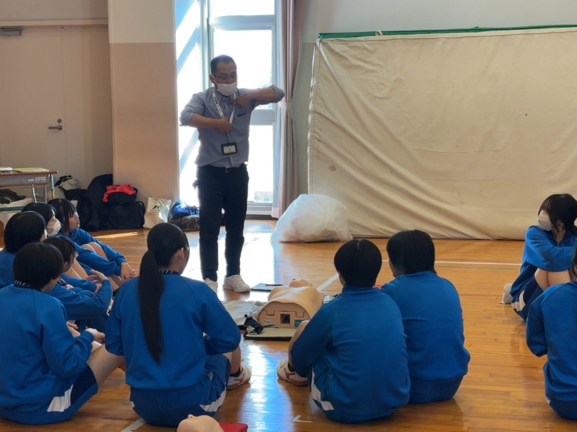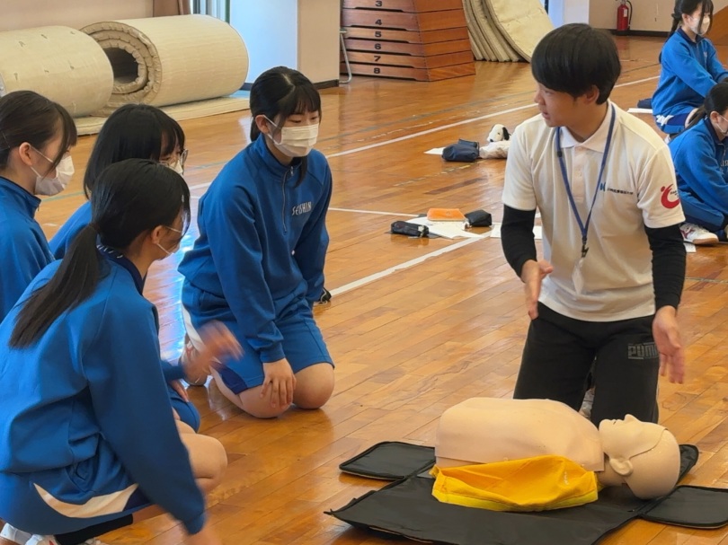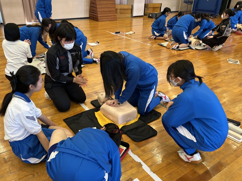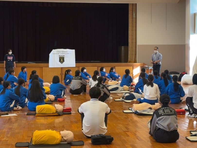川崎医療福祉大学 医療技術学部健康体育学科で救急救命士養成コースを担当されている元救急救命士の先生方が、現在教員や救急救命士を目指して学ばれている大学生の方々と共に来校され、生徒たちに実践を交えて教えてくださいました。
