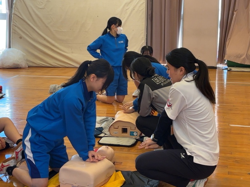 胸骨圧迫やAEDの使い方を一通り体験・実践した後、安全確認から救急救命士到着までの流れを互いに協力しながらやり切ることができました。